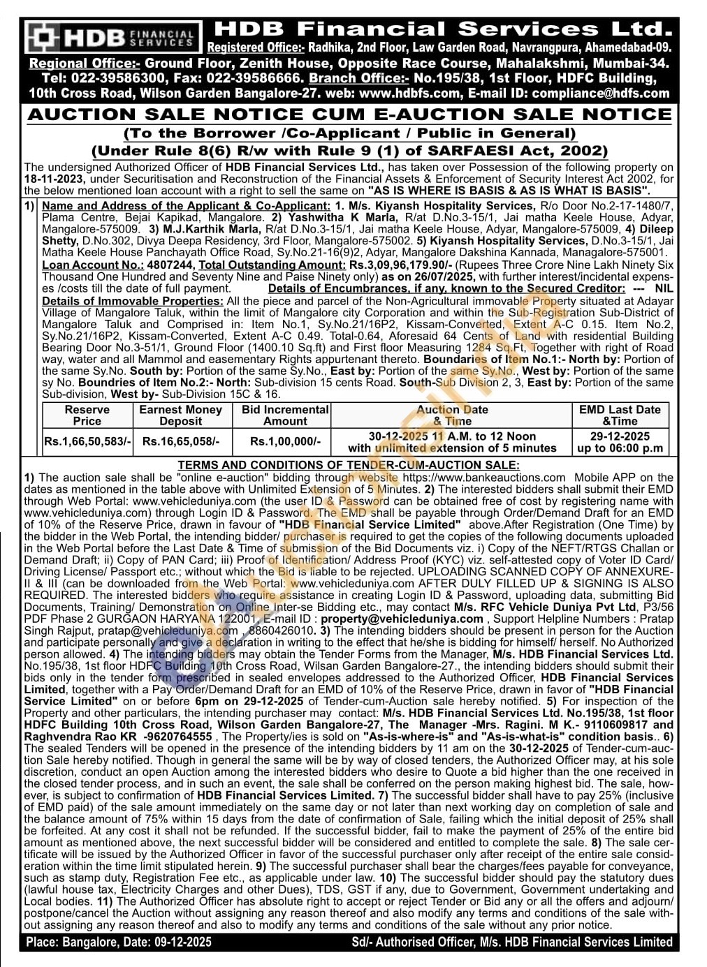 All the piece and parcel of the Non-Agricultural immovable Property situated at Adayar Village of Mangalore Taluk, within the limit of Mangalore city Corporation and within the Sub-Registration Sub-District of Mangalore Taluk and Comprised in: Item No.1, Sy.No.21/16P2, Kissam-Converted, Extent A-C 0.15. Item No.2. Sy.No.21/16P2, Kissam-Converted, Extent A-C 0.49. Total-0.64, Aforesaid 64 Cents of Land with residential Building Bearing Door No.3-51/1, Ground Floor (1400.10 Sq.ft) and First floor Measuring 1284 Sq.Ft, Together with right of Road way, water and all Mammol and easementary Rights appurtenant thereto. Boundaries of Item No.1:- North by: Portion of the same Sy.No. South by: Portion of the same Sy. No., East by: Portion of the same Sy. No., West by: Portion of the same sy No. Boundries of Item No.2:- North: Sub-division 15 cents Road, South-Sub Division 2, 3, East by: Portion of the same Sub-division, West by- Sub-Division 15C & 16.