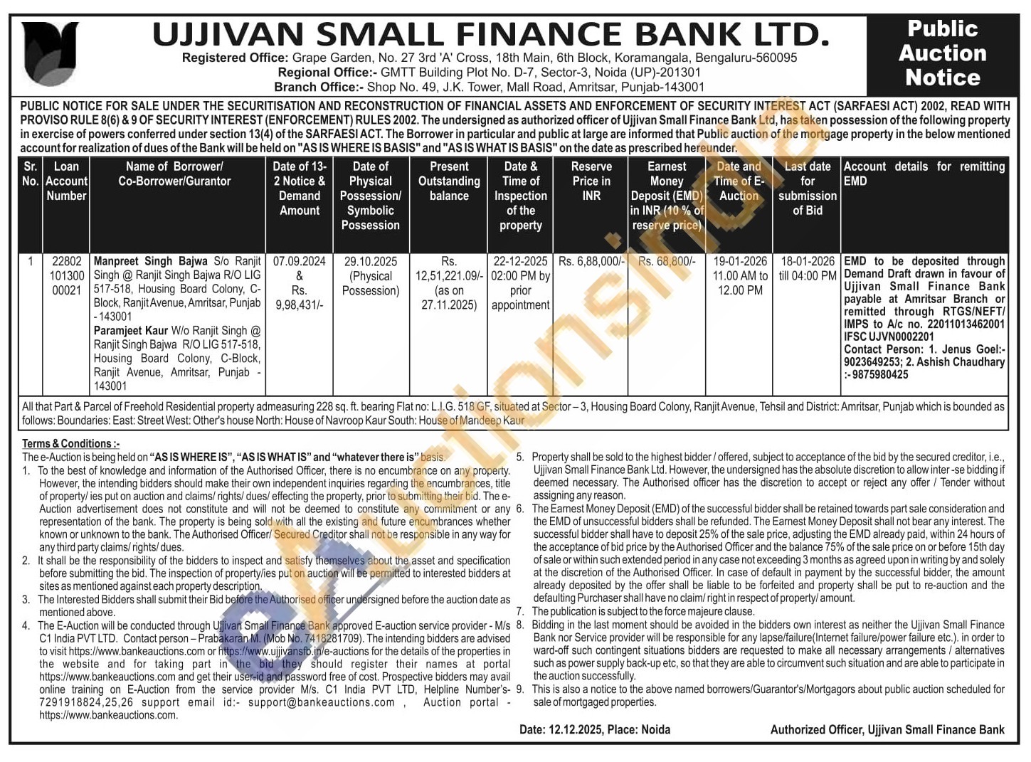 All that Part & Parcel of Freehold Residential property admeasuring 228 sq. ft. bearing Flat no: L.I.G. 518 GF, situated at Sector-3, Housing Board Colony, Ranjit Avenue, Tehsil and District: Amritsar, Punjab which is bounded as follows: Boundaries: East: Street West: Other's house North: House of Navroop Kaur South: House of Mandeep Kaur
