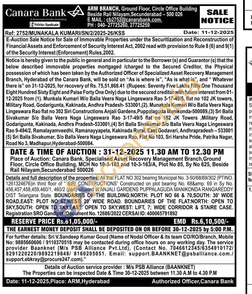 All that FLAT NO 302 bearing Municipal No. 3-50/68/69/302 (ΡΤΙΝΟ. 1261324676)in third floor of " SIRI CONSTRUCTIONS" Constructed on plot bearing No. 68& 69 in Sy No. 456,457,458,459,460/1, 460/2 (part) situated at ANJALI GARDENS PUPPALAGUDA MANIKONDA RANGAREDDY DIST Telangana State. BOUNDARIES OF THE BUILDING: NORTH: PLOT NO 66 & 70, SOUTH: 30' WIDE ROAD, EAST: PLOT NO 67, WEST: 20' WIDE ROAD. BOUNDARIES OF THE FLAT:NORTH: OPEN TO SKY, SOUTH: OPEN TO SKY,EAST: OPEN TO SKY, WEST: LIFT, 7; WIDE CORRIDOR & STAIRE CASE. Registration SRO Gandipet (Document No. 12686/2022 CERSAI ID: 400065791892