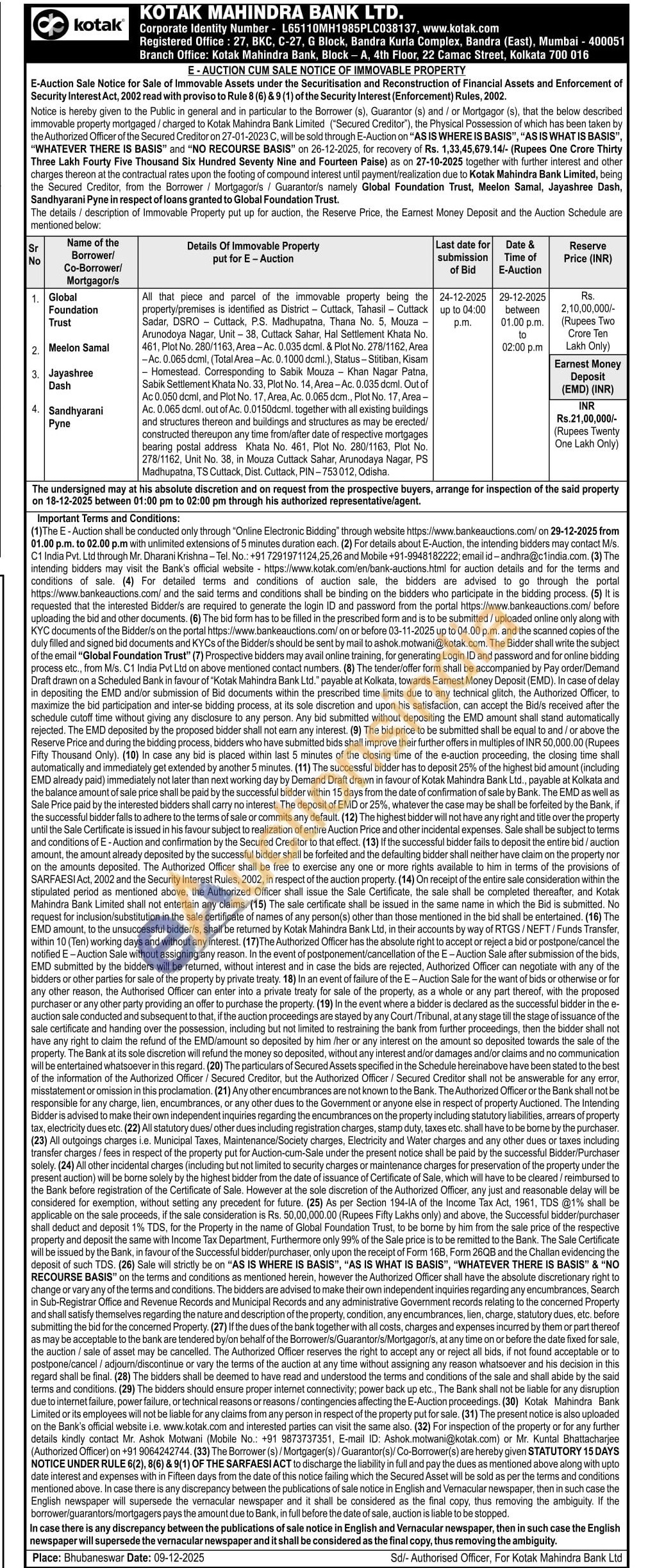 All that piece and parcel of the immovable property being the property/premises is identified as District - Cuttack, Tahasil - Cuttack Sadar, DSRO Cuttack, P.S. Madhupatna, Thana No. 5, Mouza Arunodoya Nagar, Unit-38, Cuttack Sahar, Hal Settlement Khata No. 461, Plot No. 280/1163, Area-Ac. 0.035 dcml. & Plot No. 278/1162, Area -Ac. 0.065 dcml, (Total Area-Ac. 0.1000 dcml.), Status - Stitiban, Kisam Homestead. Corresponding to Sabik Mouza Khan Nagar Patna, Sabik Settlement Khata No. 33, Plot No. 14, Area-Ac. 0.035 dcml. Out of Ac 0.050 dcml, and Plot No. 17, Area, Ac. 0.065 dcm., Plot No. 17, Area -Ac. 0.065 dcml. out of Ac. 0.0150dcml. together with all existing buildings and structures thereon and buildings and structures as may be erected/constructed thereupon any time from/after date of respective mortgages bearing postal address Khata No. 461, Plot No. 280/1163, Plot No. 278/1162, Unit No. 38, in Mouza Cuttack Sahar, Arunodaya Nagar, PS Madhupatna, TS Cuttack, Dist. Cuttack, PIN-753012, Odisha.