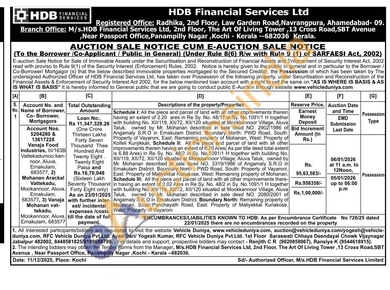 Schedule 1: All the piece and parcel of land with all other improvements therein having an extent of 2.20 ares in Re Sy. No. 48/17 in Sy. No. 1091/1 H together with building No. XII/119, XII/72, XII/120 situated at Mookkannoor Village, Aluva Taluk, owned by Mr. Mohanan described in sale deed NO. 2902/1986 of Angamaly S.R.O in Ernakulam District. Boundary North: PWD Road, South: Property of Vayaroni, East: Remaining property of Mohanan, West: Property of Kolleli Kunjikkali, Schedule II: All the piece and parcel of land with all other improvements therein having an extent of 6.70 Ares (As per title deed total extent is 6.88 Ares) in Re Sy. No. 48/2 in Sy. No.1091/1 H together with building No. XII/119, XII/72, XII/120 situated at Mookkannoor Village, Aluva Taluk, owned by Mr. Mohanan described in sale deed NO. 3319/1986 of Angamaly S.R.O in Ernakulam District. Boundary North: PWD Road, South: Property of Vayaroni, East: Property of Maliyekkal Kuriakose, West: Remaining property of Mohanan, Schedule III: All the piece and parcel of land with all other improvements there-in having an extent of 2.02 Ares in Re Sy. No. 48/2 in Sy. No.1091/1 H together Taluk, owned by Mr. Mohanan described in sale deed NO. 2080/2001 of with building No. XII/119, XII/72, XII/120 situated at Mookkannoor Village, Aluva Angamaly S.R.O in Ernakulam District. Boundary North: Remaining property of Mohanan, South: Panchayath Road, East: Property of Maliyekkal Kuriakose, tekadu, expenses/costs West: Property of Vayaroni
