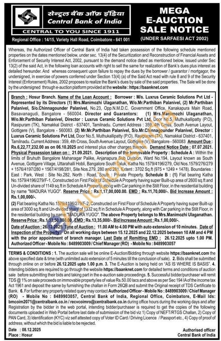 Description of the Immovable Property: Schedule A: Within the limits of Bruhuth Bangalore Mahanagar Palike, Anjanapura Sub Division, Ward No.194, Layout known as South Avenue, Gottigere Village, Uttarahalli Hobli, Bangalore South Taluk, Katha No. 1579/4196/279, Old Nos. 1579/276/279 +1576/4197/280+1567/4198/281, Site Nos. 279, 280 and 281. Extent: 3702 Sq.ft (975+1249+1478). Boundaries: East: Park, West: Site No.282, North Road, South Private Property. Schedule B: (1) Flat bearing Katha No.1579/4196/279/F-1, Constructed on First Floor of Schedule A Property having super Built-up area of 2600 sq.ft and Un-divided share of 1149 sq.ft in Schedule A Property, along with Car parking in the Stilt Floor, in the residential building
