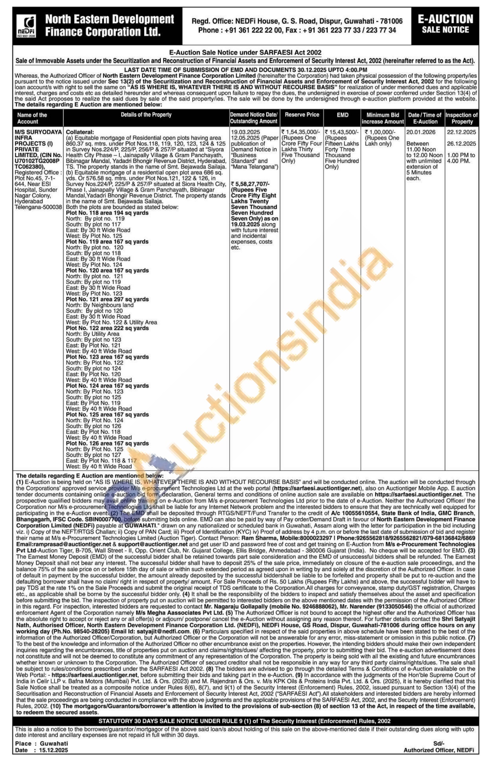a) Equitable mortgage of Residential open plots having area In Survey Nos 224/P 225/P 255/P & 257/P situated at Syora Survey Nos 224/P, 225/P, 256/P & 257/P situated at "Siyora Bibinacar Mandal Yadadri Bhongir Regenue District harabad TS. The property stands in the name of Smt. Bejav jawada Sailaja. (b) Equitable mortgage of a residential open plot area 686 sq. yds. Or 576.58 sq. mtrs. under Plot Nos. 121, 122 & 126, in Survey Nos. 224/P, 225/P & 257/P situated at Siora Health City, Phase 1, Jainapaly Village & Gram Panchayath, Bibinagar Mandal, Yadadri Bhongir Revenue District. The property stands in the name of Smt. Bejawada Sailaja. Both the plots