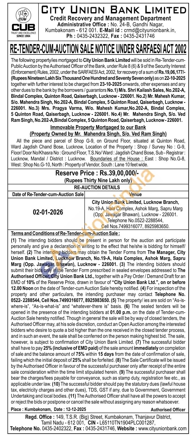 All the piece and parcel of Shop G-9, on Ground Floor, situated at Quinton Road, Ward Jagdish Chand Bose, Lucknow, Location of the Property Shop/ Survey No: G-9, Floor/Door No/Khasra No: Ground Floor, T.S.No/Ward: Jagdish Chand Bose, Sub-Registrar: Lucknow, Mandal/District: Lucknow. Boundaries of the House East: Shop No.G-8, West: Shop No.G-10, North: Property of Vendor, South: Lane 10 feet wide.
