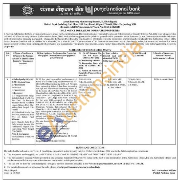 D) All that piece or parcel of land messuring 3 Katha or 0.05 Acre along with three storied res idential building measuring 1000 sq.ft (Ground Bour measuring 600 sq.ft, first floor measuring 1650 sq.ft and second floor measuring 650 sq. ft) in the name of 5h Pallab Paul 570 Sh Jyotish Chantra Paul, vide Registered Deed No 1-4939 dated 16/08/2017, registered in Book No. L. Val-same No 0711-2017, Page from 107767 80 10759 for the year 2017, recorded in Khatian No. 720(R5), 601C.IL.3 inchadest in part of Plot No. 158 (RS.1. 413 (LR), situated within Moura-Dabgram, Pargana- Baikunthapur, LL. No. 2. Sheet No.12 (8.5.1, 65 (L.JR), Ward No. 39 of Sil Iguri Municipal Corporation, P5-Bhaktinagar, Sub-Division, A.DS.R. Jalpaiguri District fal-paipari in the State of West Bengal, butted and bounded as followe The said demised land is butted and bounded as folloves North-12 feet wide Municipal Road South-Land of Snehashis Chakraborty East-Land of Shyam Ghosh West-Land of Souhashis Chakraborty Owner's Name-Sh Pallab Paul, 5/o Sh Jyotish Chandra Paul Property ID-PUNBU56675037001