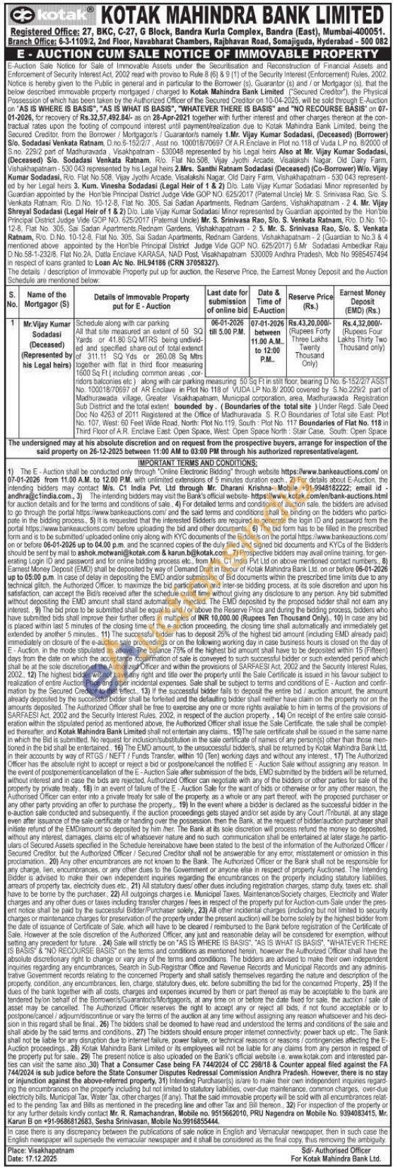 Schedule along with car parking All that site measured an extent of 50 SQ Yards or 41.80 SQ MTRS being undivid-ed and specified share out of total extenct of 311.11 SQ Yds or 260.08 Sq Mtrs together with flat in third floor measuring 1600 Sq Ft (including common areas, cor-ridors balconies etc) along with car parking measuring 50 Sq Ft in stilt floor, bearing D No. 6-152/2/7 ASST No. 100018/70697 of AR Enclave in Plot No 118 of VUDA LP No.8/ 2000 covered by S.No.229/2 part of Madhurawada village, Greater Visakhapatnam, Municipal corporation, area, Madhurawada Registration Sub Disttrict and the total extent bounded by. (Boundaries of the total site) Under Regd. Sale Deed Doc No 4263 of 2011 Registered at the Office of Madhuravada S. R.O Boundaries of Total site East: Plot No. 107, West: 60 Feet Wide Road, North: Plot No. 119, South Plot No. 117 Boundaries of Flat No. 118 in Third Floor of A.R. Enclave East: Open Space, West: Open Space North: Stair Case, South: Open Space