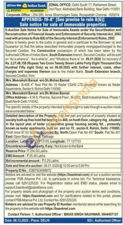 Detailed description of the Property:- All that part and parcel of property situated at society built-up free-hold flat bearing no-408, on fouth floor, category-hig, situated in the layout plan of kedar co-operative group housing society Itd., presently known as kedar apartments, built on plot no 15, sector-9, Rohini, Delhi-110085. Plinth Area 97.03 Sq mtr Bounded By: North: Open/ Flat No 407 South: Flat No.401 East: Open/Balcony West: Passage