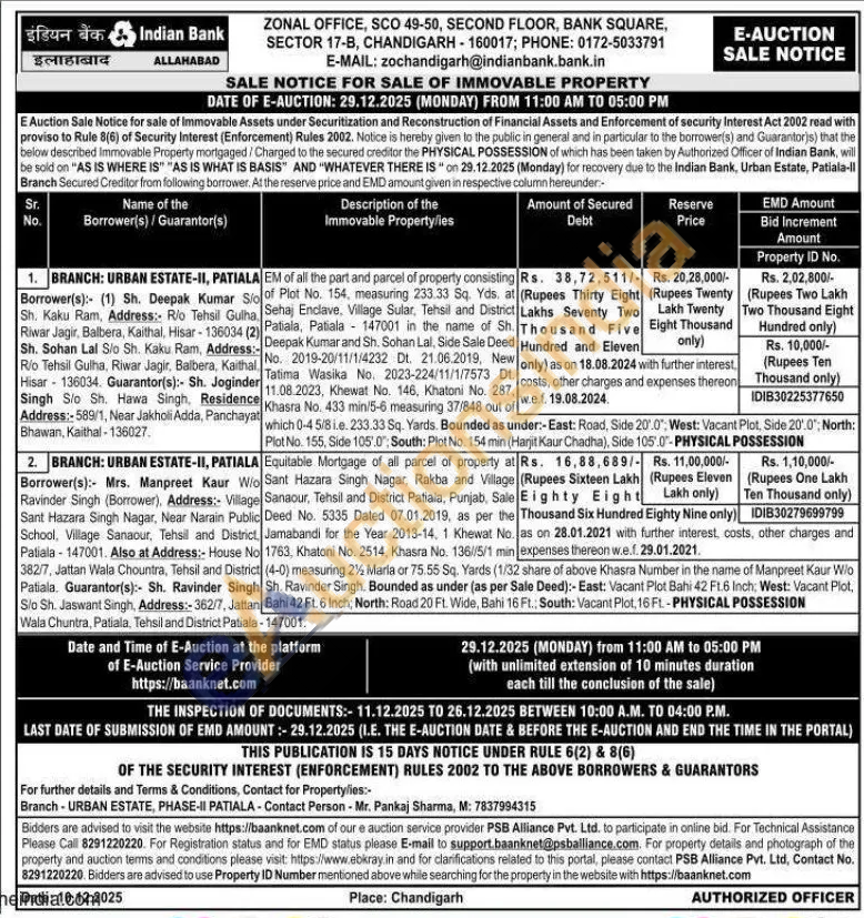 EM of all the part and parcel of property consisting of Plot No. 154, measuring 233.33 Sq. Yds. at Sehaj Enclave, Village Sular, Tehsil and District ) Patiala, Patiala 147001 in the name of Sh. - Deepak Kumar and Sh. Sohan Lal, Side Sale Deed , No. 2019-20/11/1/4232 Dt. 21.06.2019, New 11.08.2023, Khewat No. 146, Khatoni No. 287. Khasra No. 433 min/5-6 measuring 37/848 out which 0-4 5/8 i.e. 233.33 Sq. Yards. Bounded as under:- East: Road, Side 20'.0", West: Vacant Plot, Side 20'.0"; North: Plot No. 155, Side 105'.0"; South: Plot No. 154 min (Harjit Kaur Chadha), Side 105.0