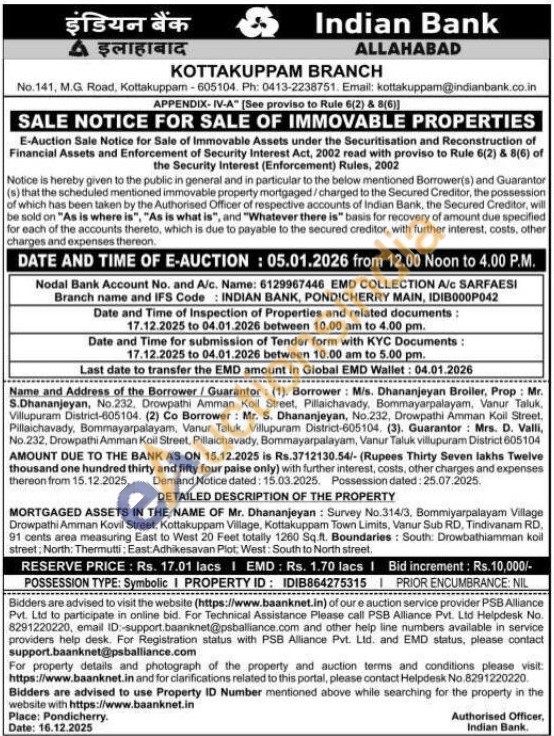 DETAILED DESCRIPTION OF THE PROPERTY : MORTGAGED ASSETS IN THE NAME OF Mr. Dhananjeyan: Survey No.314/3, Bommiyarpalayam Village Drowpathi Amman Kovil Street, Kottakuppam Village, Kottakuppam Town Limits, Vanur Sub RD, Tindivanam RD. 91 cents area measuring East to West 20 Feet totally 1260 Sq.ft. Boundaries: South: Drowbathiamman koil street; North: Thermutti: East: Adhikesavan Plot: West: South to North street.