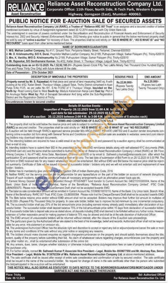 (Property owned by Mr. S. Rajasekar) All that piece and parcel of land measuring 3440 sq. ft with bulding at No 4/52. Kallar Street. Thuraiyur Village, Laigudi Taluk, Trichy District comprised in Ayan Punja S.No. 113/5, as per patta No. 181, 8.No. 113/50 of V Thuraiyur Village, bounded on the: North by: Road running East to West South by: Madura Kaliamman Nanja Land East by: Plot of Sri Arumuga Nadar West by: Plot of Senapati Servaikarar And lying within the Sub-Registration District and the Registration District of Trichy