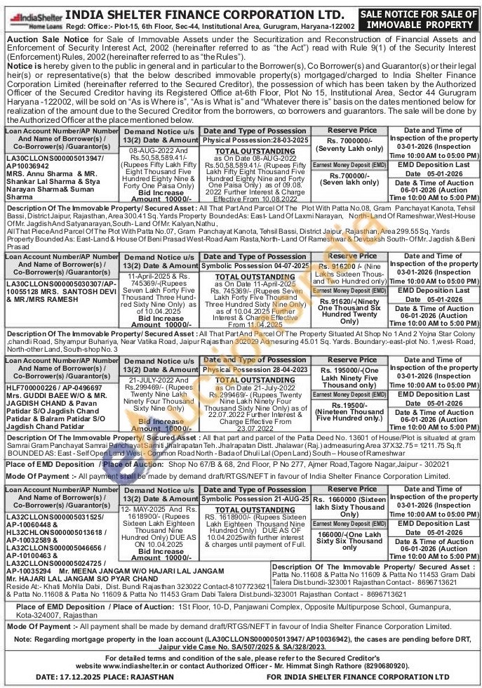 Description Of The Immovable Property/Secured Asset: All That PartAnd Parcel Of The Plot With Patta No.08, Gram Panchayat Kanota, Tehsil Bassi, District Jaipur, Rajasthan, Area 300.41 Sq. Yards Property BoundedAs: East- Land Of Laxmi Narayan, North-Land Of Rameshwar, West-House Of Mr. Jagdish And Satyanarayan, South-Land Of Mr. Kalyan, Nathu,