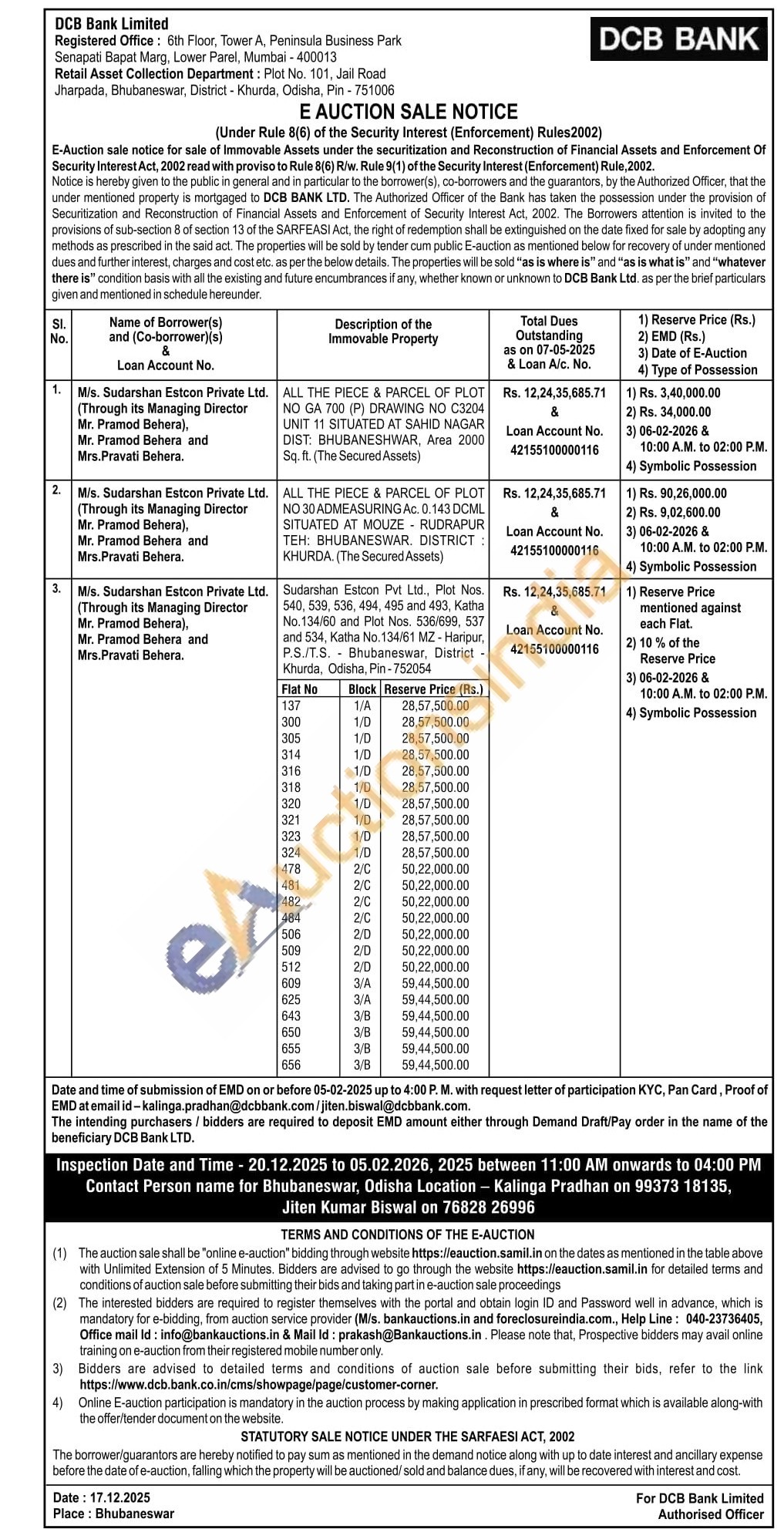 Sudarshan Estcon Pvt Ltd., Plot Nos. 540, 539, 536, 494, 495 and 493, Katha No.134/60 and Plot Nos. 536/699, 537 and 534, Katha No. 134.61 MZ-Haripur, P.S.TS. Bhubaneswar, District -Khunta. Odisha, Pin-752054