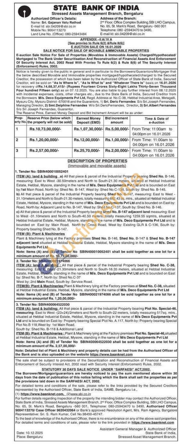 All that piece & parcel of the Industrial Property bearing Plot No. Special-46, measuring: East to West-(23+24)/2meters and North to South-22 meters, totally measuring 517sq. mtrs.. situated at Hebbal Industrial Estate, Hebbal, Mysore, standing in the name of M/s Deco Equipments Pvt Ltd and is bounded on East by: Property bearing Special Plot No. A. 117, North by: Property bearing Special Plot No.B 118, West by: 1st Main Road,