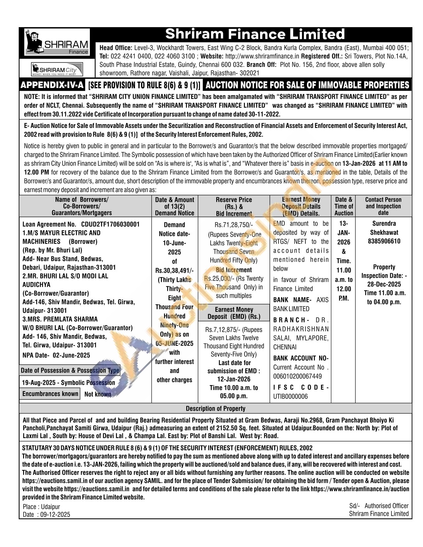 All that Piece and Parcel of and and building Bearing Residential Property Situated at Gram Bedwas, Aaraji No.2968, Gram Panchayat Bhoiyo Ki Pancholi, Panchayat Samiti Girwa, Udaipur (Raj.) admeasuring an extent of 2152.50 Sq. feet. Situated at Udaipur.Bounded on the: North by: Plot of Laxmi Lal, South by: House of Devi Lal, & Champa Lal. East by: Plot of Banshi Lal. West by: Road.