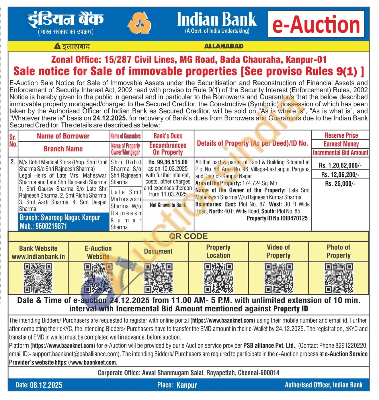All that part & parcel of Land & Building Situated at Plot No. 86, Arazi No. 96, Village-Lakhanpur, Pargana and District-Kanpur Nagar. Area of the Property: 174.724 Sq. Mtr Name of the Owner of the Property: Late Smt Maheswari Sharma W/o Rajneesh Kumar Sharma Boundaries: East: Plot No. 87, West: 30 Ft Wide Road, North: 40 Ft Wide Road, South: Plot No. 85