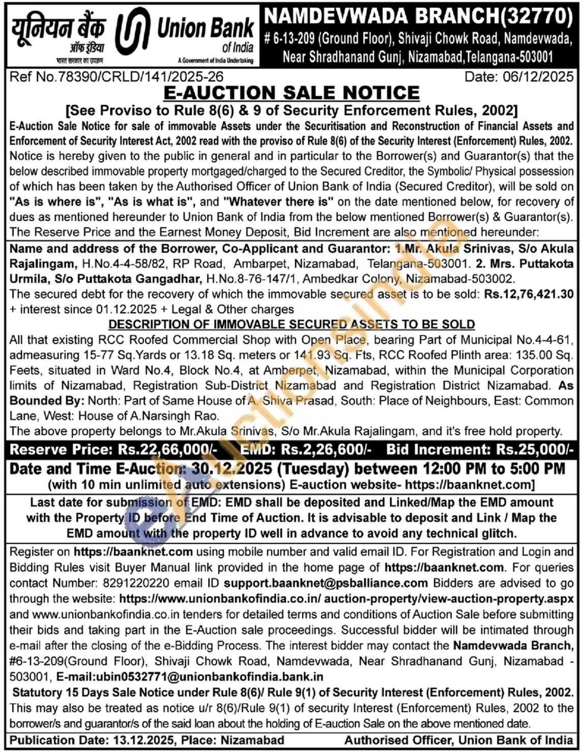 All that existing RCC Roofed Commercial Shop with Open Place, bearing Part of Municipal No.4-4-61, admeasuring 15-77 Sq. Yards or 13.18 Sq. meters or 141.93 Sq. Fts, RCC Roofed Plinth area: 135.00 Sq. Feets, situated in Ward No.4, Block No.4, at Amberpet, Nizamabad, within the Municipal Corporation limits of Nizamabad, Registration Sub-District Nizamabad and Registration District Nizamabad. As Bounded By: North: Part of Same House of A. Shiva Prasad, South: Place of Neighbours, East: Common Lane, West: House of A.Narsingh Rao