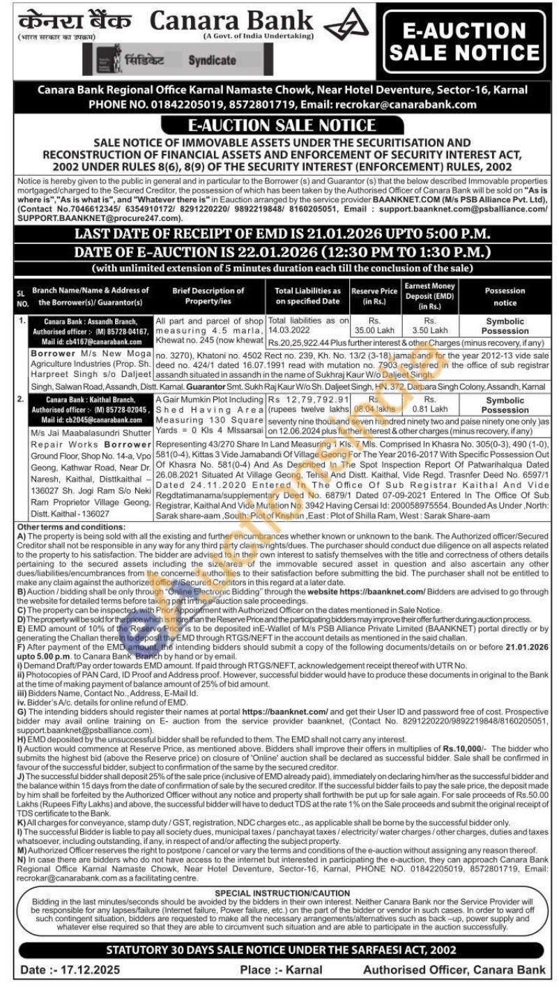 Contact Authorised officer: (M) 85728-04167, Mail id: cb4167@canarabank.com