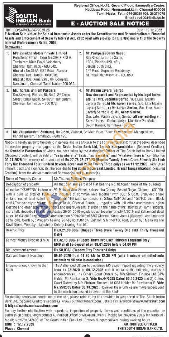 All that part and parcel of Flat bearing No. 18, fourth floor of the building named as "KSHETRA" in door no.29, Mahalakshmi Street, Kalakshetra Colony, Besant Nagar, Chennai-600090. with a built up area of 1950 Sq.ft inclusive of common area together with 983. 15 Sq.ft. undivided share of land out of total extent of 7 grounds 166 sq.ft comprised in S.Nos 158/108 and 158/100 part, Block no.54. Thiruvanmiyur Village, Saidapet Taluk, Chennai District, together with all other easementary rights existing and other appurtenant rights and improvements thereon in the name of Mr. Thomas William Pangaraj. more fully described in Sale deed dated 29-01-2010 registered as document no.544/2010 and Settlement deed dated 16-04-2019 registered as document no.5999/2019 of SRO Chennai South Joint I (Saidapet) and bounded as follows, North by Property bearing Survey no.158/10A, East by: S.N.158/10C Part, South by Mahalakshmi Kovil Street, West by: Kalashetra Colony bearing S.N.161