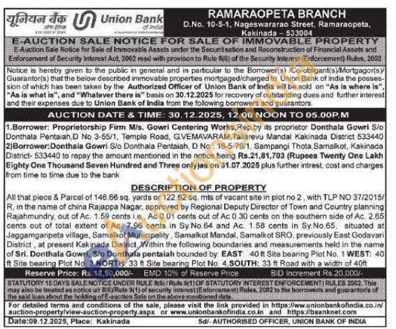All that piece & Parcel of 146.66 sq. yards or 122.62 sq. mts of vacant site in plot no 2, with TLP NO 37/2015/R, in the name of china Rajappa Nagar, approved by Regional Deputy Director of Town and Country planning Rajahmundry, out of Ac. 1.59 cents i.e., Ac 0.01 cents out of Ac 0.30 cents on the southern side of Ac. 2.65 cents out of total extent of Ac. 7.96 cents in Sy.No.64 and Ac. 1.58 cents in Sy. No.65, situated at Jaggamgarnipeta village, Samalkot Municipality, Samalkot Mandal, Samalkot SRO, previously East Godavari District, at present Kakinada District. Within the following boundaries and measurements held in the name of Sri. Donthala Gowri, S/o Donthala pentaiah bounded by: EAST: 40 ft Site bearing Plot No. 1 WEST: 40 it Site bearing Plot No. 3, NORTH: 33 ft Site bearing Plot No 4 SOUTH: 33 ft Road with a width of 40ft