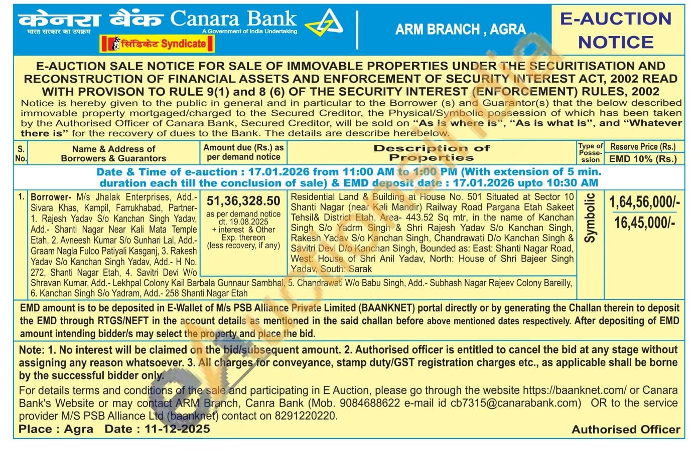 Residential Land & Building at House No. 501 Situated at Sector 10 Shanti Nagar (near Kali Mandir) Railway Road Pargana Etah Sakeet Tehsil& District Etah, Area- 443.52 Sq mtr, in the name of Kanchan Singh S/o Yadrm Singh & Shri Rajesh Yadav S/o Kanchan Singh, Rakesh Yadav S/o Kanchan Singh, Chandrawati D/o Kanchan Singh & Savitri Devi D/o Kanchan Singh, Bounded as: East: Shanti Nagar Road, West: House of Shri Anil Yadav, North: House of Shri Bajeer Singh Yadav, South: Sarak