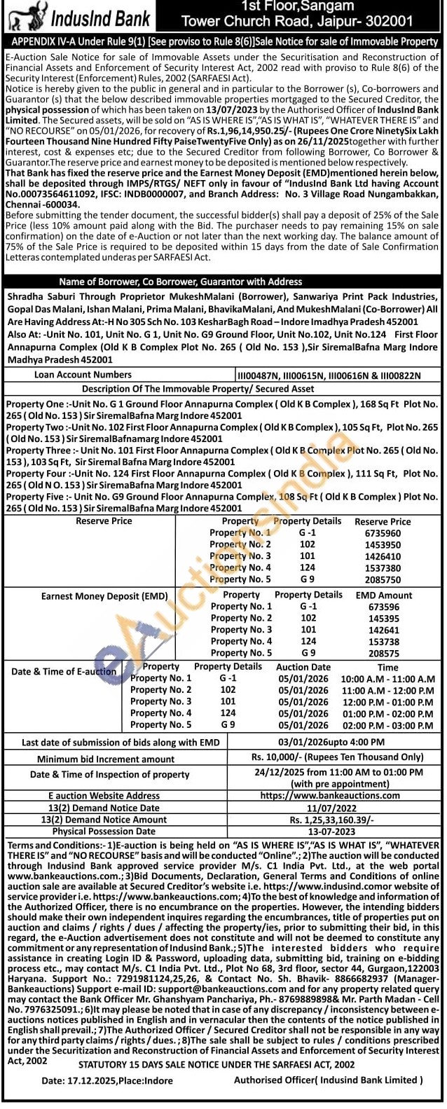 Property Three:- Unit No. 101 First Floor Annapurna Complex (Old KB Complex Plot No. 265 (Old No. 153), 103 Sq Ft, Sir Siremal Bafna Marg Indore 452001