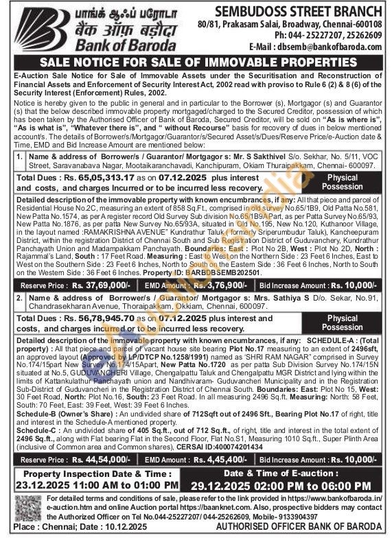 Detailed description of the immovable property with known encumbrances, if any: All that piece and parcel of Residential House No.2C, measuring an extent of 858 Sq.Ft., comprised in old survey No.65/1B9, Old Patta No.581, New Patta No. 1574, as per A register record Old Survey Sub division No.65/1B9APart, as per Patta Survey No.65/93, New Patta No. 1876, as per patta New Survey No.65/93A, situated in Old No. 195, New No. 120, Kuthanoor Village, in the layout named : RAMAKRISHNA AVENUE" Kundrathur Taluk (formerly Sriperumbudur Taluk), Kancheepuram District, within the registration District of Chennai South and Sub Registration District of Guduvanchery, Kundrathur Panchayath Union and Madampakkam Panchayath. Boundaries: East: Plot No 2B, West: Plot No 2D, North: Rajammal's Land, South: 17 Feet Road. Measuring: East to West on the Northern Side: 23 Feet 6 Inches, East to West on the Southern Side: 23 Feet 6 Inches, North to South on the Eastem Side: 36 Feet 6 Inches, North to South on the Westem Side: 36 Feet 6 Inches. Property ID: BARBDBSEMB202501