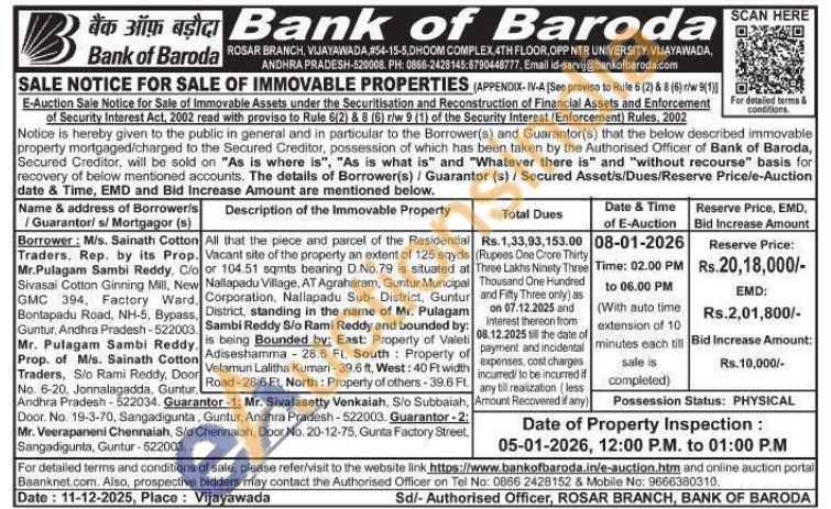 All that the piece and parcel of the Residential Vacant site of the property an extent of 125 sqyds or 104.51 sqmts bearing D.No. 79 is situated at Nallapadu Village, AT Agraharam, Guntur Muncipal Corporation, Nallapadu Sub-District, Guntur District, standing in the name of Mr. Pulagam Sambi Reddy S/o Rami Reddy and bounded by: is Bounded by: East: Property of Valeti Adiseshamma -28.6 Ft. South: Property of Velamun Lalitha Kumari-39.6 ft, West: 40 Ft width Road-28.6 Ft. North: Property of others-39.6 Ft