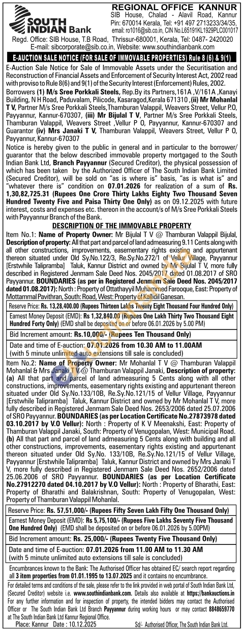 Description of property: (a) All that part and parcel of land admeasuring 5 Cents along with all other constructions, improvements, easementary rights existing and appurtenant thereon situated under Old Sy.No.133/10B, Re.Sy. No.121/15 of Vellur Village, Payyannur [Erstwhile Talipramba) Taluk, Kannur District and owned by Mr Mohanlal TV, more fully described in Registered Jenmam Sale Deed Nos. 2653/2006 dated 25.07.2006 of SRO Payyannur. BOUNDARIES (as per Location Certificate No.27873978 dated 03.10.2017 by V.O Vellur): North Property of KV Meenakshi, East: Property of Thamburan Valappil Janaki, South: Property of Venugopalan, West: Municipal Road. (b) All that part and parcel of land admeasuring 5 Cents along with building and all other constructions, improvements, easementary rights existing and appurtenant thereon situated under Old Sy.No. 133/10B, Re.Sy.No.121/15 of Vellur Village, Payyannur [Erstwhile Talipramba] Taluk, Kannur District and owned by Mrs Janaki T V, more fully described in Registered Jenmam Sale Deed Nos. 2652/2006 dated 25.06.2006 of SRO Payyannur. BOUNDARIES (as per Location Certificate No.27912270 dated 04.10.2017 by V.0 Vellur): North: Property of Bharathi, East: Property of Bharathi and Balakrishnan, South: Property of Venugopalan
