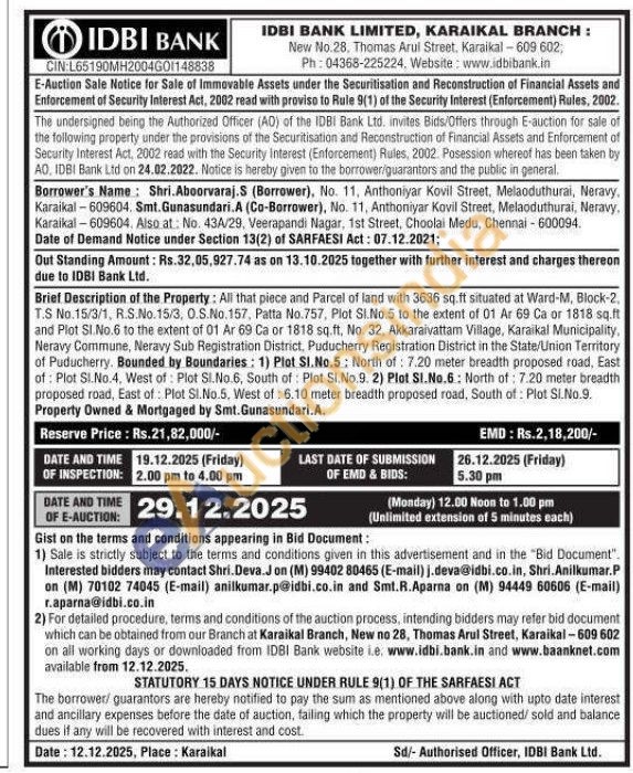 Brief Description of the Property: All that piece and Parcel of land with 3636 sq.ft situated at Ward-M, Block-2, T.S No. 15/3/1, R.S.No. 15/3, O.S.No. 157, Patta No.757, Plot Sl.No.5 to the extent of 01 Ar 69 Ca or 1818 sq.ft and Plot SI.No.6 to the extent of 01 Ar 69 Ca or 1818 sq.ft, No. 32, Akkaraivattam Village, Karaikal Municipality, Neravy Commune, Neravy Sub Registration District, Puducherry Registration District in the State/Union Territory of Puducherry. Bounded by Boundaries: 1) Plot Sl. No.5: North of: 7.20 meter breadth proposed road, East of: Plot Sl.No.4, West of: Plot Sl.No.6, South of Plot Sl.No.9. 2) Plot SI.No.6: North of: 7.20 meter breadth proposed road, East of: Plot Sl.No.5, West of: 6.10 meter breadth proposed road, South of: Plot Sl.No.9. Property Owned & Mortgaged by Smt. Gunasundari.A