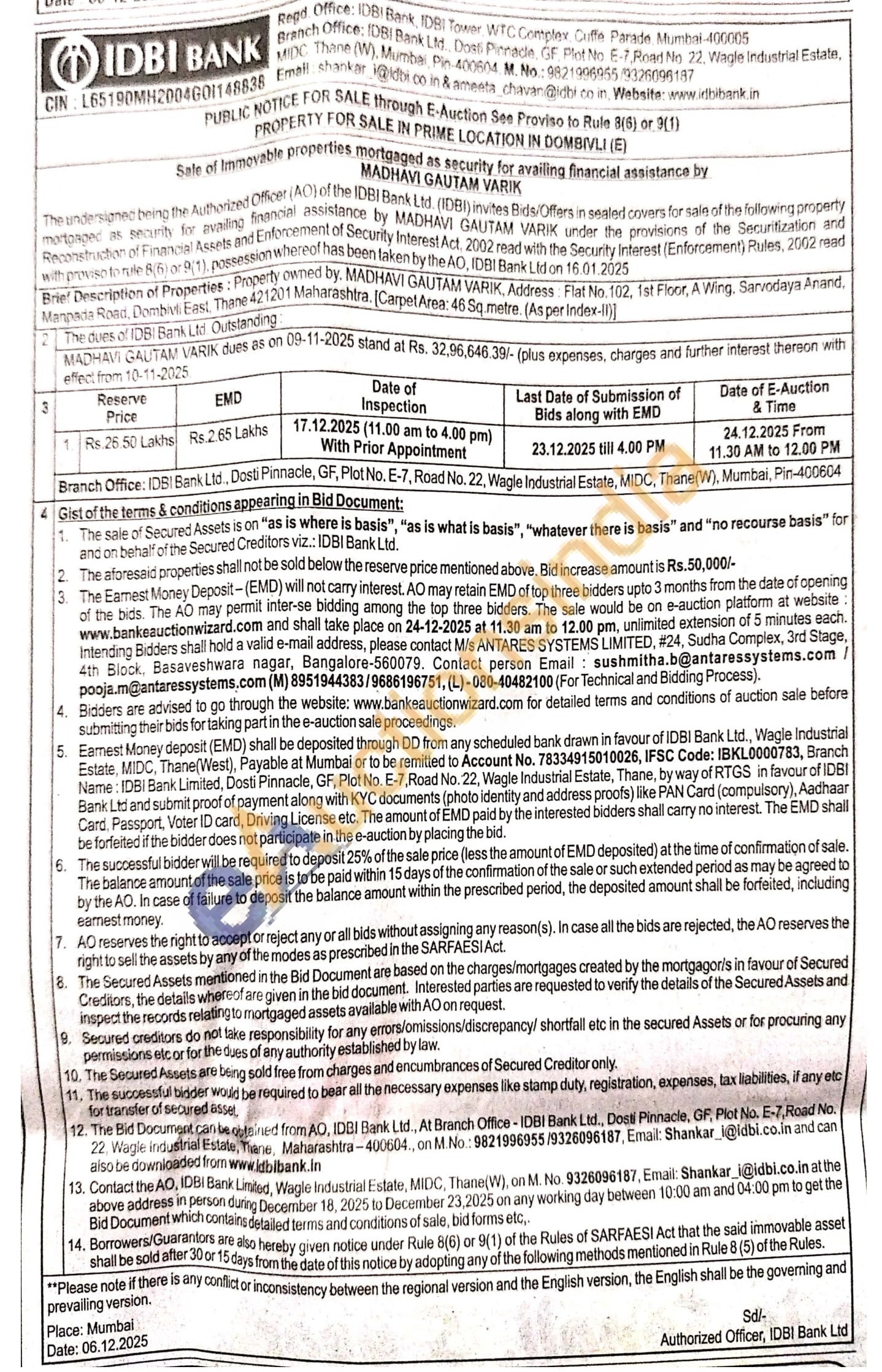 Description of Properties: Property owned by. MADHAVI GAUTAM VARIK, Address: Flat No. 102, 1st Floor, A Wing, Sarvodaya Anand, Manpada Road, Dombivli East, Thane 421201 Maharashtra. [Carpet Area: 46 Sq.metre. (As per Index-11)]