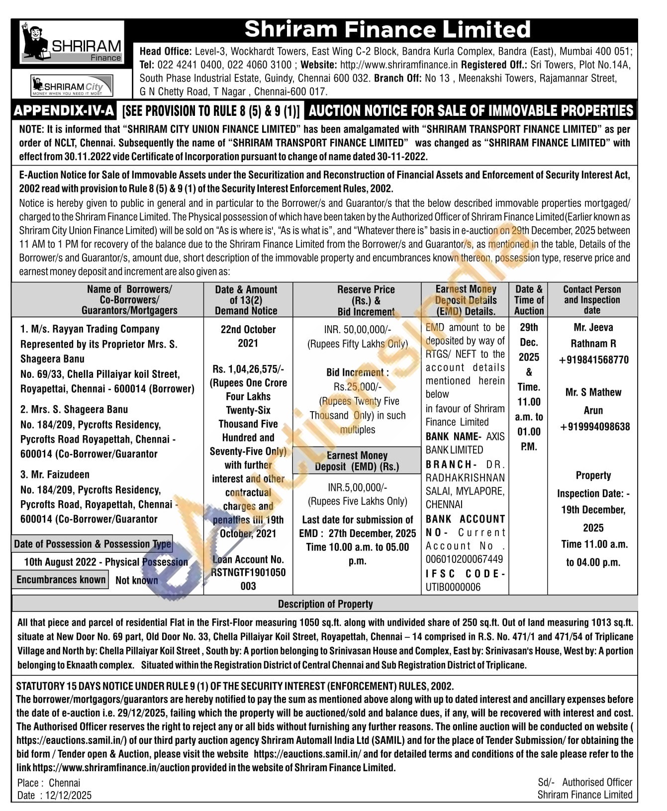 All that piece and parcel of residential Flat in the First-Floor measuring 1050 sq.ft. along with undivided share of 250 sq.ft. Out of land measuring 1013 sq.ft. situate at New Door No. 69 part, Old Door No. 33, Chella Pillaiyar Koil Street, Royapettah, Chennai-14 comprised in R.S. No. 471/1 and 471/54 of Triplicane Village and North by: Chella Pillaiyar Koil Street, South by: A portion belonging to Srinivasan House and Complex, East by: Srinivasan's House, West by: A portion belonging to Eknaath complex. Situated within the Registration District of Central Chennai and Sub Registration District of Triplicane.