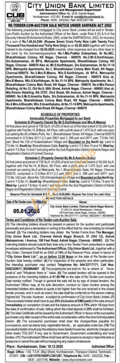 Immovable Properties Mortgaged to our Bank Schedule B (Property Owned By Mr.S.Karthikeyan and Mrs.R.Meena) : All that piece and parcel of 738 Sq.ft. of UDS of land out of the total extent of 39,264 Sq.ft. together with Fiat No. 15, B Block, 4th Floor, with a plinth area of 1,475 Sq.ft. with one open car parking No.65 at Metro Polis, No.1, Bharathidasan Street, KK Nagar, Chennai 600078 comprised in O.S.Nos.301/1,2,3 part 295/1 and 2, 296 part and 297/1 part, T.S.No. 14/2 part, Block No.129 of Kodambakkam Village and Bounded on the North by: Land in T.S.No. 14, South by: Bharathidasan Salai, East by: Land in T.S. Nos. 15 and 19, West by: Land in T.S.Nos. 12 and 7 and lying within the Sub Registration District of Ashok Nagar and Registration District of Central Chennai.
