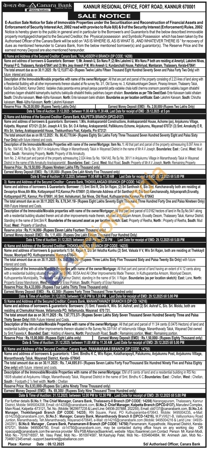 Description of the Immovable/Movable properties with name of the owner/Mortgager: All that are part and parcel of the property consisting of 2.23 Ares of land along with a Residential Building with all other improvements thereon situated at Re survey No. 3/1, Old Survey no. 3, Kizhakkumbhagam Desom, Pinarayi Amsom, Thalaserry Taluk, Kadirur Sub-District, Kannur District. Vadakke chala paramba enna jamayil peraya parambil petta vadakke chala kattil chernna oramsom parambil vadakku bagam sthalathil padinharu bagam sthalathil kaimariyathu kazhichu bakkiyulla sthalathil thekku padinharu bagam sthalam. Boundaries as per Title Deed:East- Ente Kaivasam bakki sthalam South: Chirutha kaivasam, West-Ajitha Kaivasam, North: Ente kaivasam bakki sthalam. Boundaries as per location certificate: East-Lakshmi Kaivsam, South: Chirutha kaivasam, West- Ajitha Kaivasam, North: Lakshmi Kaivasam