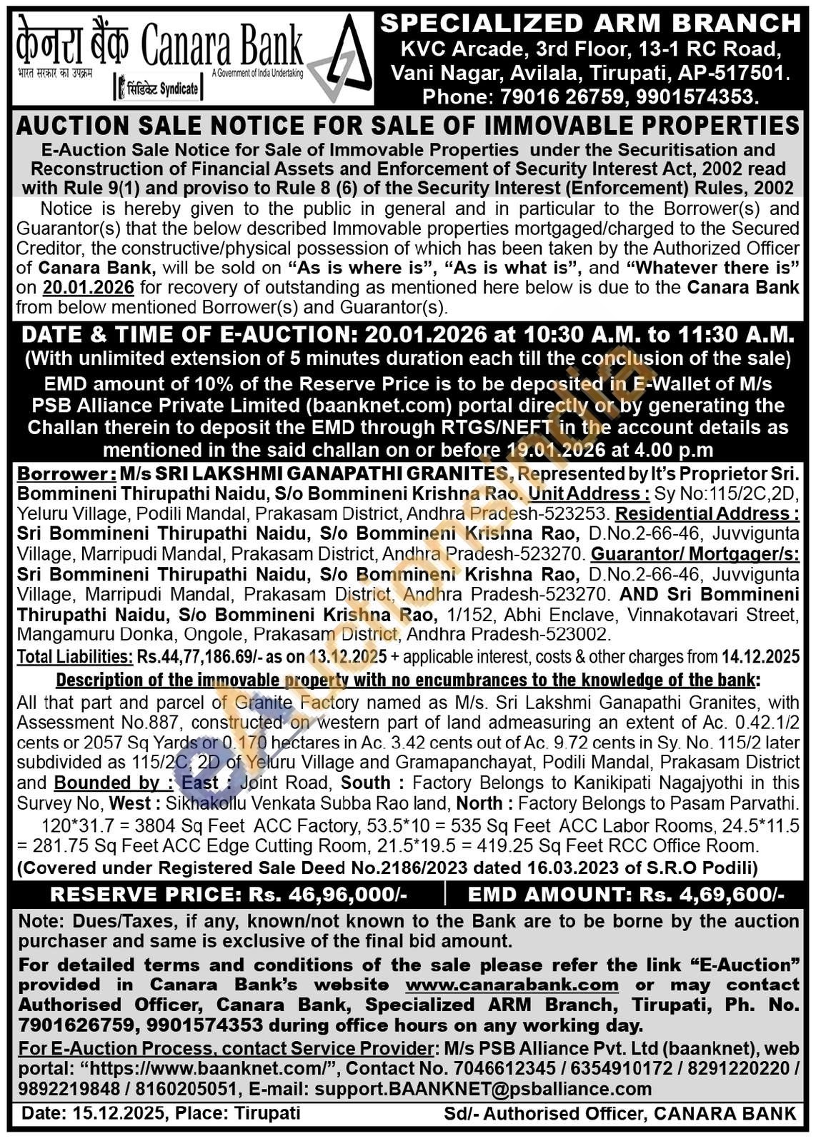 Description of the immovable property with no encumbrances to the knowledge of the bank: All that part and parcel of Granite Factory named as M/s. Sri Lakshmi Ganapathi Granites, with Assessment No.887, constructed on western part of land admeasuring an extent of Ac. 0.42.1/2 cents or 2057 Sq Yards or 0.170 hectares in Ac. 3.42 cents out of Ac. 9.72 cents in Sy. No. 115/2 later subdivided as 115/2C, 2D of Yeluru Village and Gramapanchayat, Podili Mandal, Prakasam District and Bounded by: East: Joint Road, South Factory Belongs to Kanikipati Nagajyothi in this Survey No, West: Sikhakollu Venkata Subba Rao land, North: Factory Belongs to Pasam Parvathi. 120*31.7 3804 Sq Feet ACC Factory, 53.5*10 = 535 Sq Feet ACC Labor Rooms, 24.5*11.5 = 281.75 Sq Feet ACC Edge Cutting Room, 21.5*19.5 = 419.25 Sq Feet RCC Office Room.