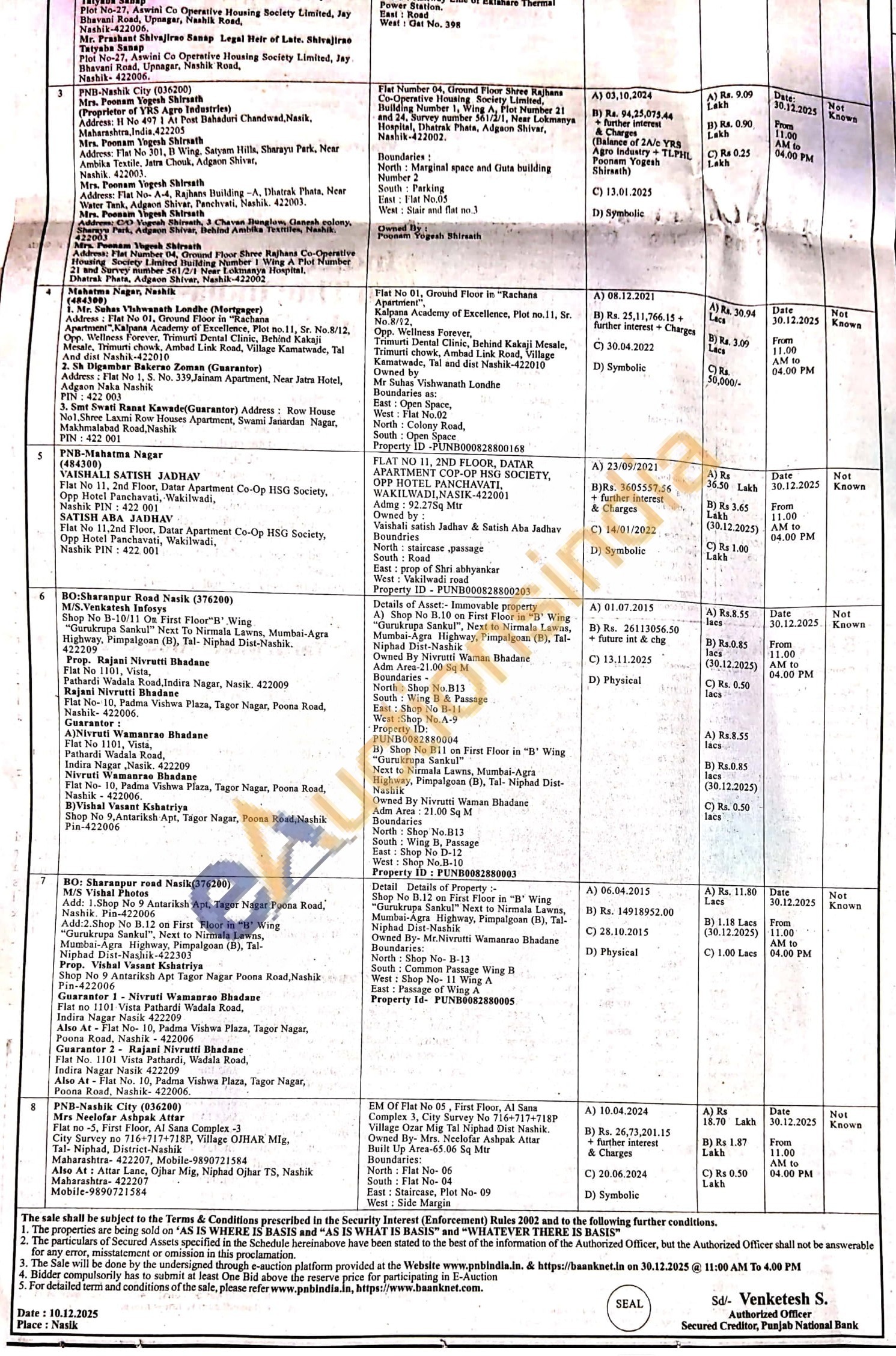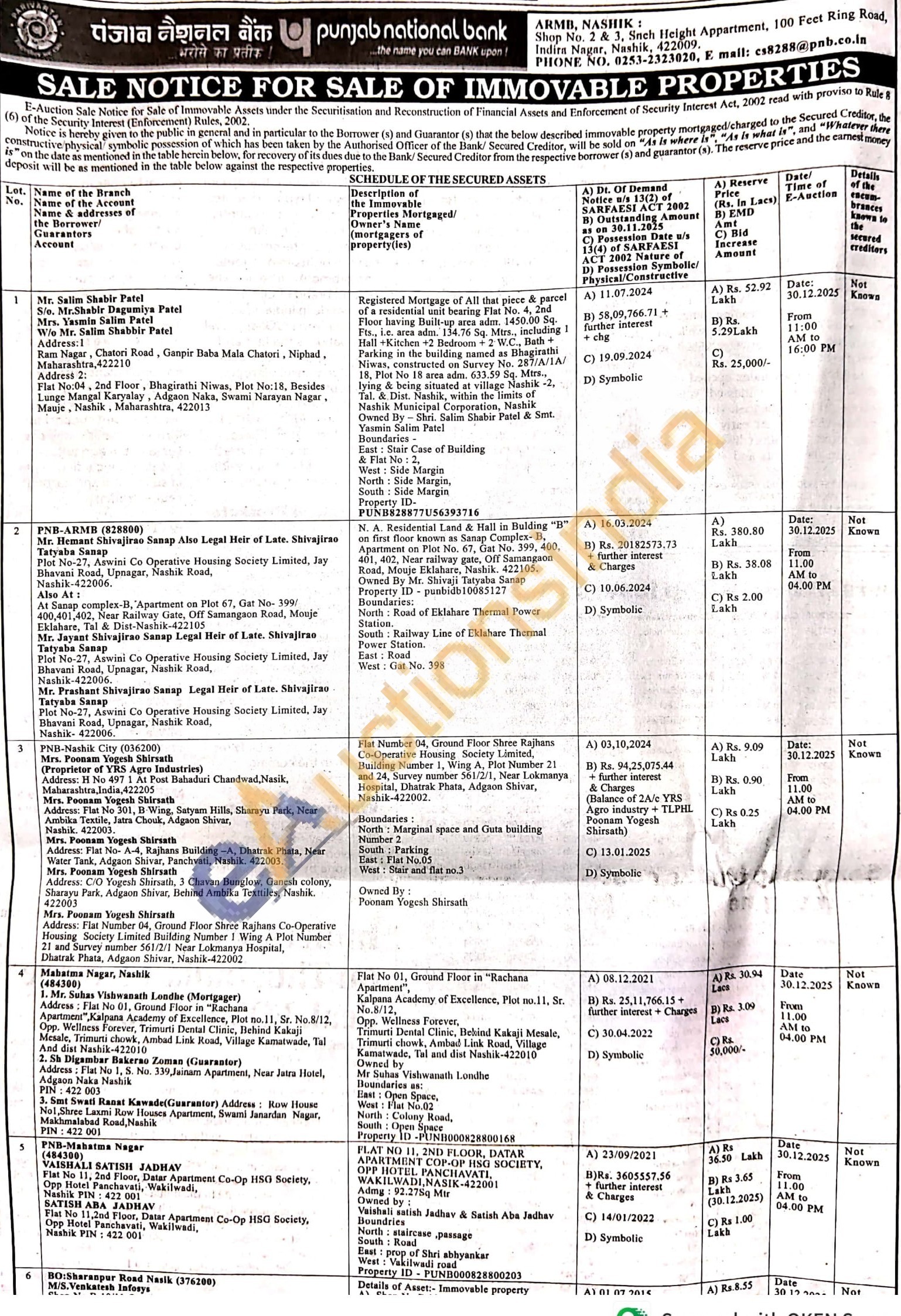 Details of Asset: Immovable property A) Shop No B.10 on First Floor in "B" Wing "Gurukrupa Sankul", Next to Nirmala Lawns, Mumbai-Agra Highway, Pimpalgoan (B), Tal-Niphad Dist-Nashik Owned By Nivrutti Waman Bhadane Adm Area-21.00 Sq M Boundaries -North: Shop No.B13 South: Wing B & Passage East: Shop No B-11 West:Shop No.A-9 Property ID: PUNB0082880004