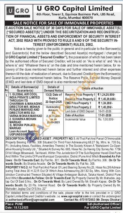 PROPERTY NO. 1: All That Part And Parcel Of Immovable Property Bearing Flat No. 308 Situated On Third Floor Admeasuring 68.27 Sq. Mtrs. le. 735 Sq. Ft. (Including Areas, Facilities, Amenities Thereto) In The Society Known A "Mahalaxmi Co-Oper-ative Housing Society Ltd.," Situated At Survey No. 685, Hissa No. 2a Having City Survey No. 1756 Of At Village Bibwewadi, Tal-Haveli, Within The Jurisdiction Of The Sub Registrar Haveli Dist-Pune And Within The Limits Of Pune Municipal Corporation, District Pune And Which Bounded As Fol- lows: On Or Towards East: By Flat No. 301: On Or Towards West: By Flat No. 306. On Or To-wards South: By Sharda Arcade: On Or Towards North: By Flat No. 305.