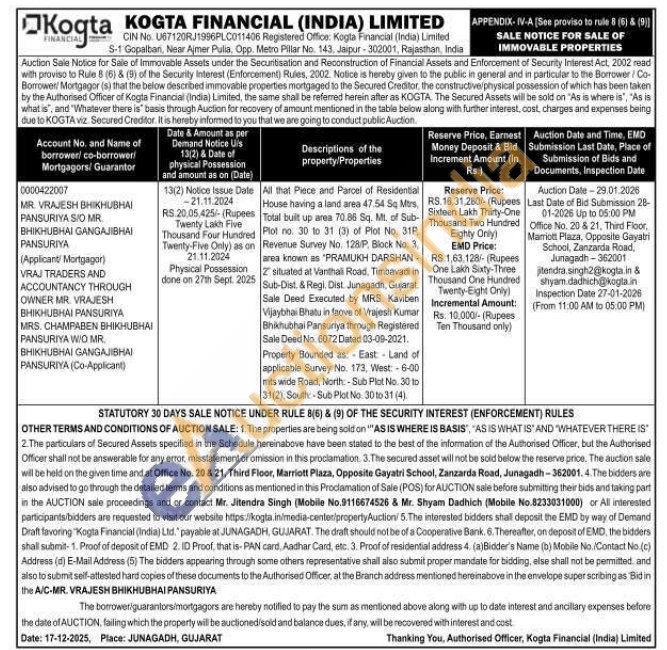 All that Piece and Parcel of Residential House having a land area 47.54 Sq Mes, Total built up area 70.86 Sq. Mt. of Sub-Plot no. 30 to 31 (3) of Plot No. 31P Revenue Survey No. 128/P, Block No. 3 area known as "PRAMUKH DARSHAN 2 situated at Vanthali Road, Timbavadi in Sub-Dist. & Regi. Dist. Junagadh, Gujarat Sale Deed Executed by MRS. Kaviben Vijaybhai Bhatu in faove of Vrajesh Kumar Bhikhubhai Pansuriya through Registered Sale Deed No. 6072 Dated 03-09-2021. Property Bounded as East Land of applicable Survey No. 173, West: -6-00 mits wide Road, North: Sub Plot No. 30 to 31(2), South - Sub Plot No. 30 to 31 (4