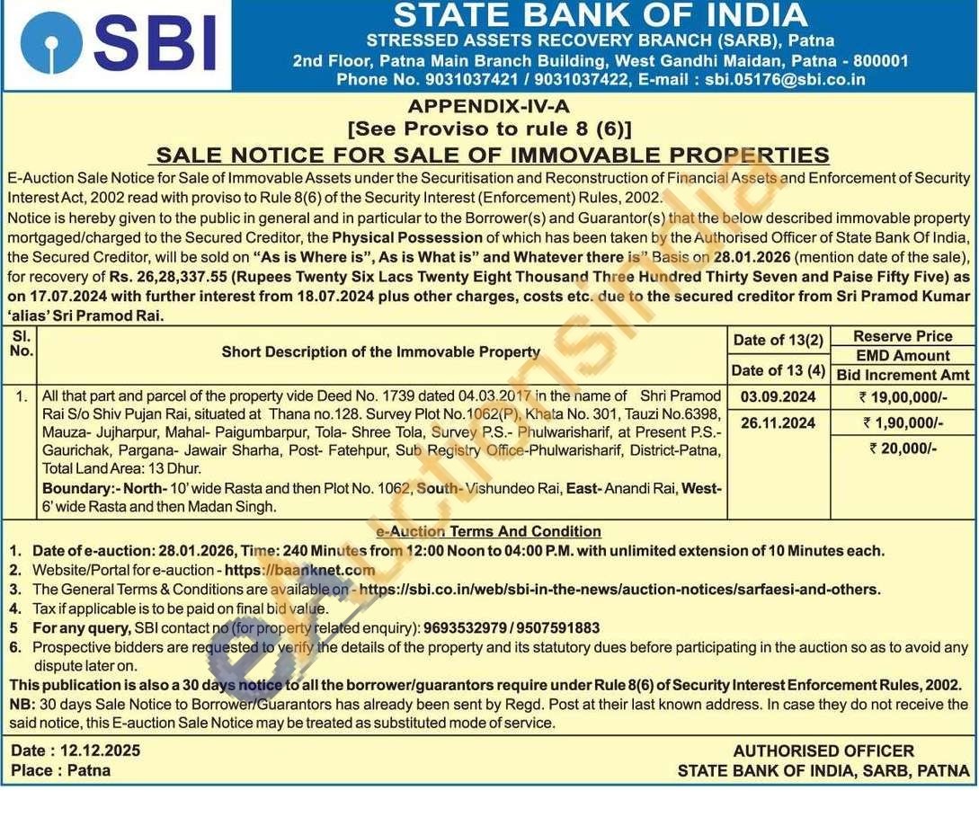 All that part and parcel of the property vide Deed No. 1739 dated 04.03.2017 in the name of Shri Pramod Rai S/o Shiv Pujan Rai, situated at Thana no. 128. Survey Plot No. 1062(P), Khata No. 301, Tauzi No.6398, Mauza- Jujharpur, Mahal- Paigumbarpur, Tola- Shree Tola, Survey P.S.- Phulwarisharif, at Present P.S.-Gaurichak, Pargana- Jawair Sharha, Post- Fatehpur, Sub Registry Office-Phulwarisharif, District-Patna, Total Land Area: 13 Dhur
