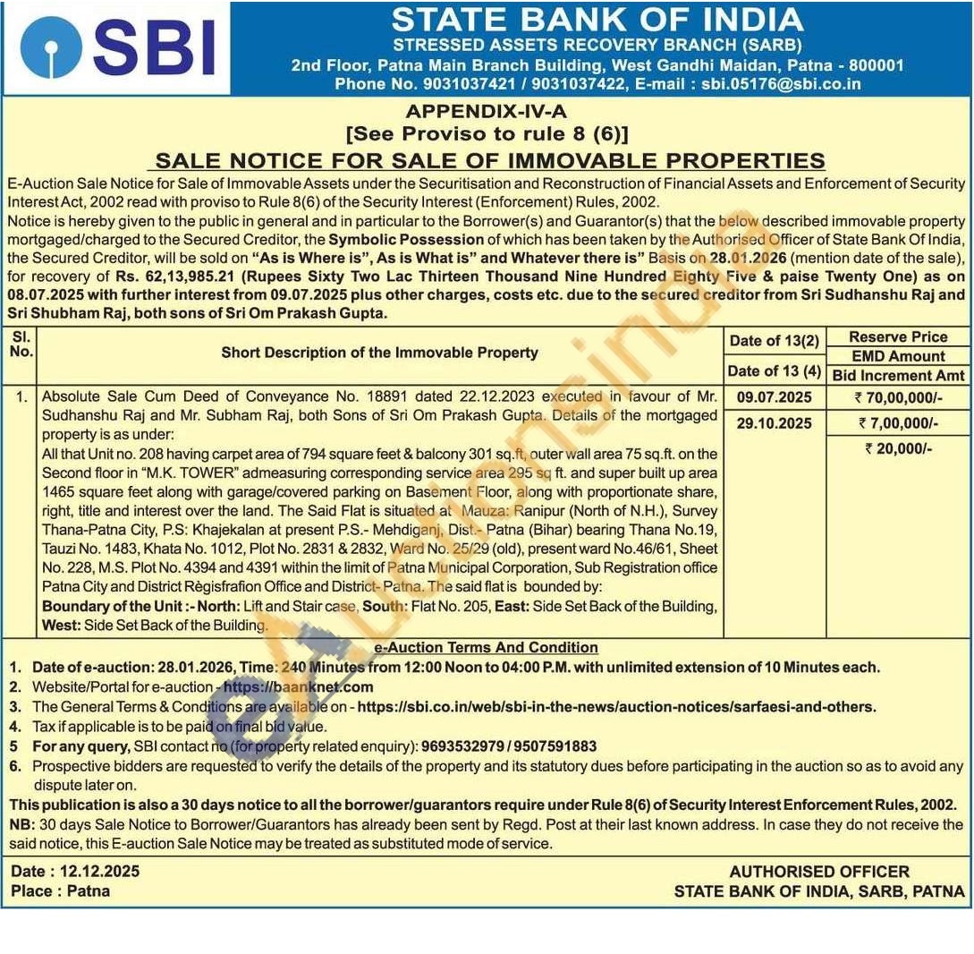 Absolute Sale Cum Deed of Conveyance No. 18891 dated 22.12.2023 executed in favour of Mr. Sudhanshu Raj and Mr. Subham Raj, both Sons of Sri Om Prakash Gupta. Details of the mortgaged property is as under: All that Unit no. 208 having carpet area of 794 square feet & balcony 301 sq.ft, outer wall area 75 sq.ft. on the Second floor in "M.K. TOWER" admeasuring corresponding service area 295 sq ft. and super built up area 1465 square feet along with garage/covered parking on Basement Floor, along with proportionate share, right, title and interest over the land. The Said Flat is situated at Mauza: Ranipur (North of N.H.), Survey Thana-Patna City, P.S: Khajekalan at present P.S.- Mehdiganj, Dist.- Patna (Bihar) bearing Thana No.19, Tauzi No. 1483, Khata No. 1012, Plot No. 2831 & 2832, Ward No. 25/29 (old), present ward No.46/61, Sheet No. 228, M.S. Plot No. 4394 and 4391 within the limit of Patna Municipal Corporation, Sub Registration office Patna City and District Règisfrafion Office and District-Patna. The said flat is bounded by: Boundary of the Unit:-North: Lift and Stair case, South: Flat No. 205, East: Side Set Back of the Building, West: Side Set Back of the Building.