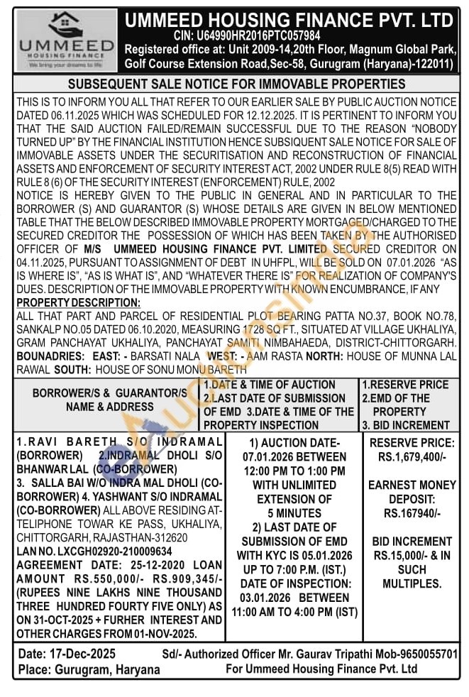 ALL THAT PART AND PARCEL OF RESIDENTIAL PLOT BEARING PATTA NO.37, BOOK NO.78, SANKALP NO.05 DATED 06.10.2020, MEASURING 1728 SQ FT., SITUATED AT VILLAGE UKHALIYA, GRAM PANCHAYAT UKHALIYA, PANCHAYAT SAMITI NIMBAHAEDA, DISTRICT-CHITTORGARH. BOUNADRIES: EAST: BARSATI NALA WEST: AAM RASTA NORTH: HOUSE OF MUNNA LAL RAWAL SOUTH: HOUSE OF SONU MONU BARETH
