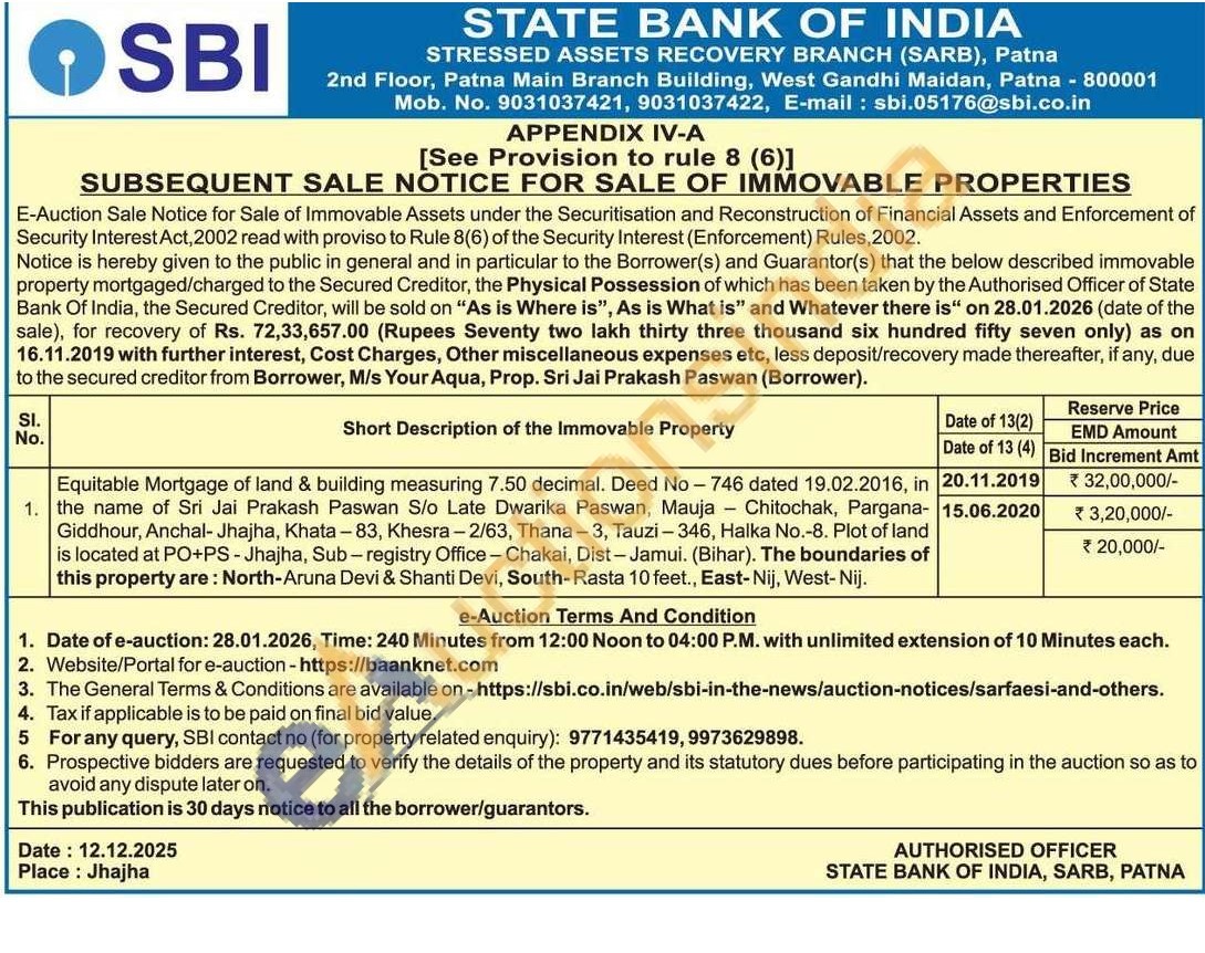 Equitable Mortgage of land & building measuring 7.50 decimal. Deed No-746 dated 19.02.2016, in the name of Sri Jai Prakash Paswan S/o Late Dwarika Paswan, Mauja Chitochak, Pargana-Giddhour, Anchal-Jhajha, Khata -83, Khesra-2/63, Thana-3, Tauzi-346, Halka No.-8. Plot of land is located at PO+PS-Jhajha, Sub-registry Office - Chakai, Dist-Jamui. (Bihar). The boundaries of this property are: North-Aruna Devi & Shanti Devi, South-Rasta 10 feet., East-Nij, West-Nij.
