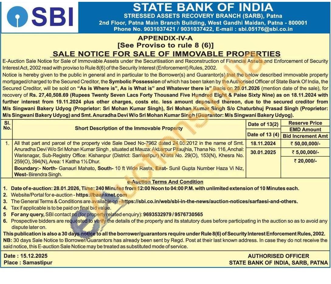 All that part and parcel of the property vide Sale Deed No-7962 dated 24.05.2012 in the name of Smt. Anuradha Devi W/o Sri Mohan Kumar Singh, situated at Mauza: Akbarpur Pitaujhia, Thana No. 116, Anchal: Warisnagar, Sub-Registry Office: Kishanpur (District: Samastipur) Khata No. 29(O), 153(N), Khesra No. 259(0), 394(Ν), Area: 1 Kattha 1½ Dhur. Boundary:- North- Ganauri Mahato, South- 10 ft Wide Rasta, East- Sunil Gupta Number Haza Vi Niz, West-Birendra Singh