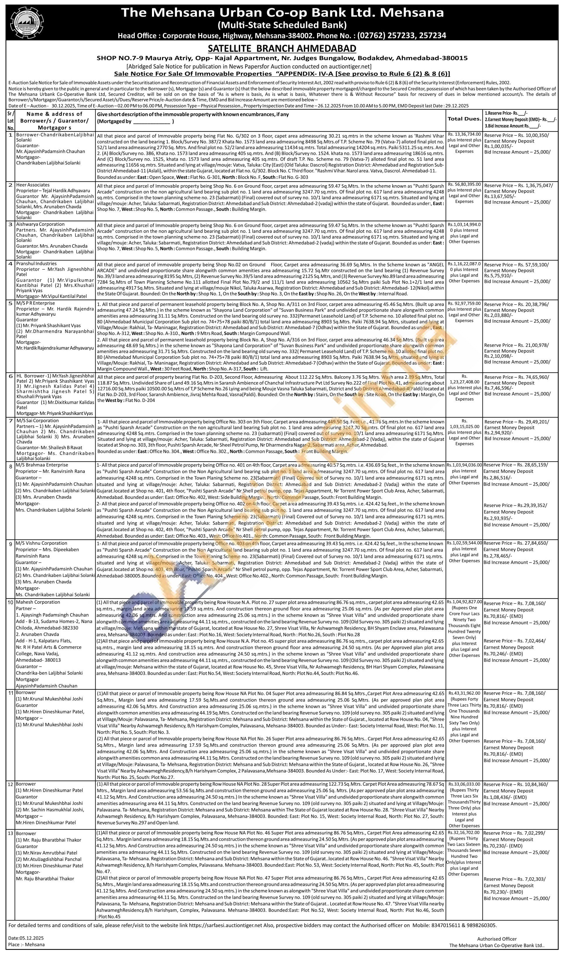 (2)All that piece and parcel of Immovable property being Row House N.A. Plot no. 45 super plot area admeasuring 86.76 sq.mtrs., carpet plot area admeasuring 42.65 sq.mtrs., margin land area admeasuring 18.15 sq.mtrs. And construction thereon ground floor area admeasuring 24.50 sq.mtrs. (As per Approved plan plot area admeasuring 41.12 sq.mtrs. And construction area admeasuring 24.50 sq.mtrs.) in the scheme known as "Shree Visat Villa" and undivided proportionate share alongwith common amenities area admeasuring 44.11 sq.mtrs., constructed on the land bearing Revenue Survey no. 109 (Old Survey no. 305 paiki 2) situated and lying at village/mouje: Mehsana within the state of Gujarat, located at Row House No. 45, Shree Visat Villa, Nr Ashwamegh Residency, BH Hari Shyam Complex, Palawasana area, Mehsana-384003, Bounded as under: East: Plot No.54, West: Society Internal Road, North: Plot No.44, South: Plot No.46.