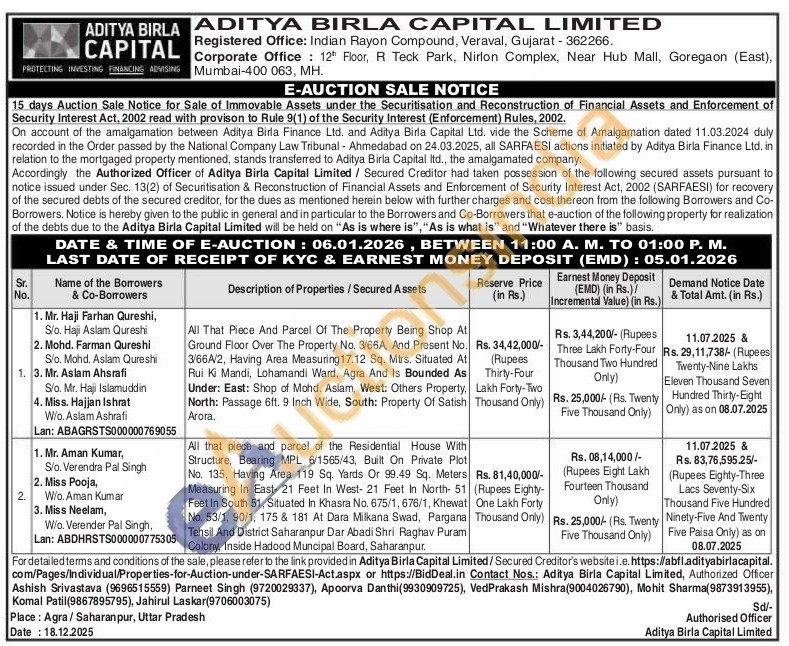 All that piece and parcel of the Residential House With Structure, Bearing MPL 6/1565/43, Built On Private Plot No. 135, Having Area 119 Sq. Yards Or 99.49 Sq. Meters Measuring In East- 21 Feet In West-21 Feet In North- 51 Feet In South 51, Situated In Khasra No. 675/1, 676/1, Khewat No. 53/1, 90/1, 175 & 181 At Dara Milkana Swad, Pargana Tehsil And District Saharanpur Dar Abadi Shri Raghav Puram Colony, Inside Hadood Muncipal Board, Saharanpur.