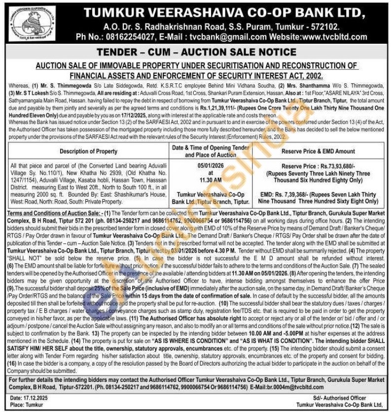 All that piece and parcel of (the Converted Land bearing Aduvalli Village Sy. No.110/1), New Khatha No 2939, (Old Khatha No. 1247/1154), Aduvalli Village, Kasaba hobli, Hassan Town, Hasssan District. measuring East to West 20ft., North to South 100 ft., in all measuring 2000 sq. ft. Bounded By: East: Shashikumar's House, West: Road, North: Road, South: Private Property