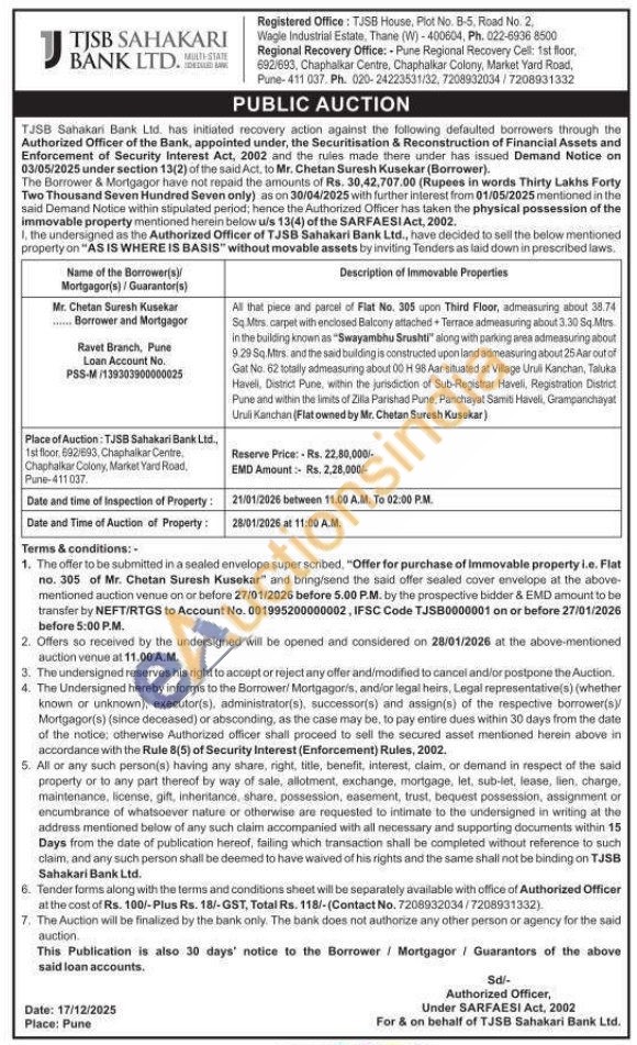 All that piece and parcel of Flat No. 305 upon Third Floor, admeasuring about 38.74 Sq.Mirs, carpet with enclosed Balcony attached Terrace admeasuring about 3.30 Sq.Mirs in the building known as "Swayambhu Srushti along with parking area admeasuring about 9.29 Sq. Mirs, and the said building is constructed upon land admeasuring about 25 Aar out of Gat No. 62 totally admeasuring about 00 H 98 Aar situated at Village Urull Kanchan, Taluka Havell, District Pune, within the jurisdiction of Sub-Registrar Haveli, Registration District Pune and within the limits of Zilla Parishad Pune, Panchayat Samiti Haveli, Grampanchayat Unuli Kanchan (Flat owned by Mr. Chetan Suresh Kusekar)