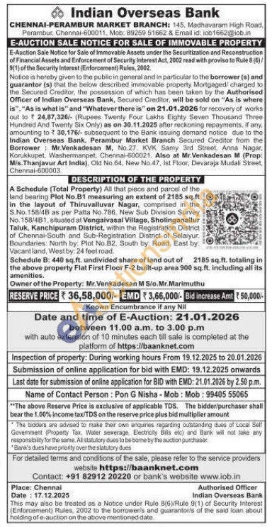 A Schedule (Total Property) All that piece and parcel of the land bearing Plot No.81 measuring an extent of 2185 sq.ft in the layout of Thiruvalluvar Nagar, comprised in the S.No. 158/48 as per Patta No.786. New Sub Division Survey No. 158/481, situated at Vengaivasal Village, Sholinganallur Taluk, Kanchipuram District, within the Registration District of Chennai-South and Sub-Registration District of Selaiyur. Boundaries: North by: Plot No.82. South by Road, East by Vacant land, West by: 24 feet road. Schedule B: 440 sq.ft. undivided share of land out of 2185 sq.ft. totaling in the above property Flat First Floor F-2 built-up area 900 sq.ft. including all its amenities. Owner of the Property: Mr.Venkadesan M Sio.Mr.Marimuthu