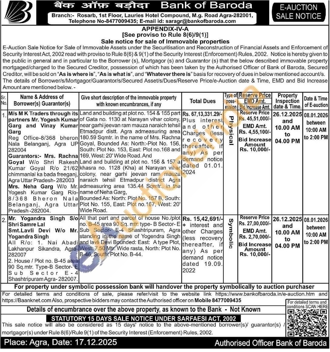 Land and building at plot no. 154 & 155 part of Gata no. 1130 at Narayan vihar colony, near garhi jeevan ram mauza naraich tehsil Etmadpur distt. Agra admeasuring area 180.59 Sqmtr. in the name of Mrs. Rachna Goyal, Bounded As: North:-Plot No. 156. South: Plot No. 153, East: Plot no. 168 and 169, West: 20' Wide Road. And