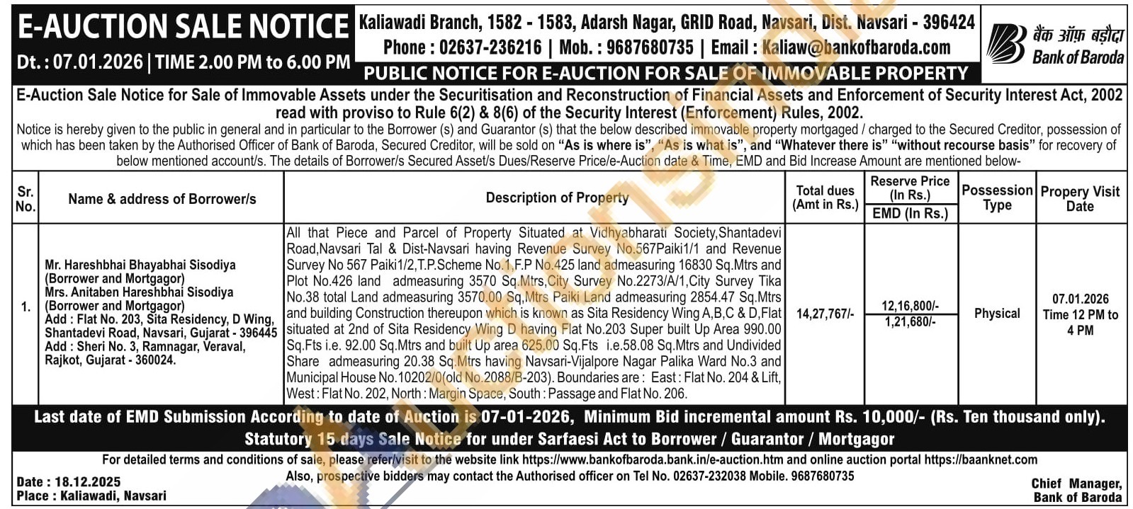 All that Piece and Parcel of Property Situated at Vidhyabharati Society, Shantadevi Road, Navsari Tal & Dist-Navsari having Revenue Survey No.567Paiki1/1 and Revenue Survey No 567 Paiki1/2, T.P.Scheme No.1,F.P No.425 land admeasuring 16830 Sq.Mtrs and Plot No.426 land admeasuring 3570 Sq.Mtrs, City Survey No.2273/A/1, City Survey Tika No.38 total Land admeasuring 3570.00 Sq. Mtrs Paiki Land admeasuring 2854.47 Sq.Mtrs and building Construction thereupon which is known as Sita Residency Wing A,B,C & D. Flat situated at 2nd of Sita Residency Wing D having Flat No.203 Super built Up Area 990.00 Sq. Fts i.e. 92.00 Sq.Mtrs and built Up area 625.00 Sq. Fts i.e.58.08 Sq.Mtrs and Undivided Share admeasuring 20.38 Sq.Mtrs having Navsari-Vijalpore Nagar Palika Ward No.3 and Municipal House No. 10202/0(old No.2088/B-203). Boundaries are: East: Flat No. 204 & Lift, West: Flat No. 202, North: Margin Space, South: Passage and Flat No. 206