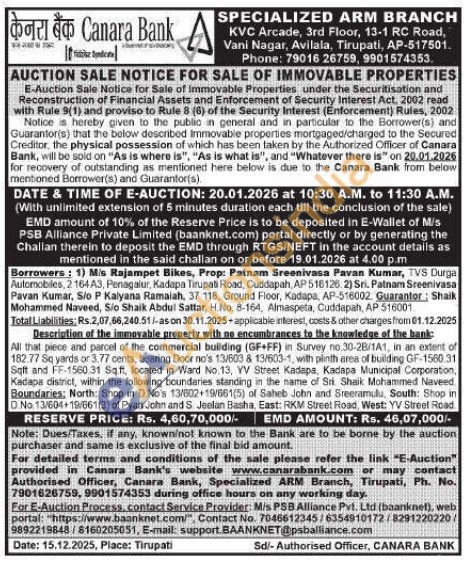 Description of the immovable property with no encumbrances to the knowledge of the bank: All that piece and parcel of the commercial building (GF+FF) in Survey no.30-28/1A1, in an extent of 182.77 Sq yards or 3.77 cents, bearing Door no's 13/603 & 13/603-1, with pinth area of building GF-1560.31 Sqft and FF-1560.31 Sqft, located in Ward No.13, VV Street Kadapa, Kadapa Municipal Corporation, Kadapa district, within the following boundaries standing in the name of Sri Shaik Mohammed Naveed Boundaries; North: Shop in D.No's 13/802+19/661(5) of Saheb John and Sreeramulu, South: Shop in D.No: 13/604+19/661(3) of Pyari John and S. Jeelan Basha, East: RKM Street Road, West: YV Street Road